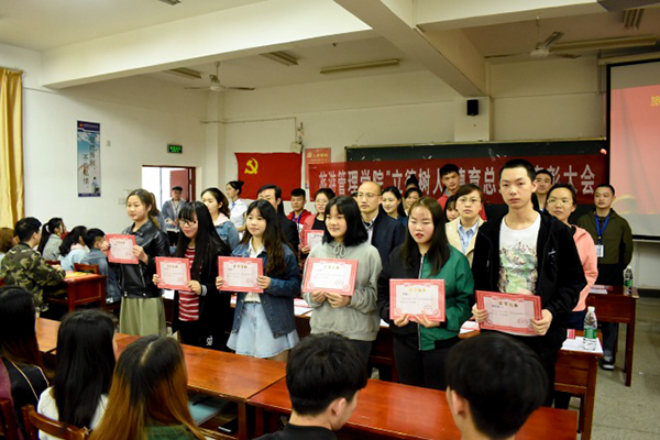 立德树人,德行天下。为规范学生言行、提高学生整体素质、培养当代大学生优秀的品行、品质,培养通识人才,2017年下学期起,旅管学院推行了《"立德树人"综合素质管理办法》。推行一年以来,取得了显著效果。为总结经验,表彰先进,树立典型,带动后进,同时也为了推动德育工作更好的进行,旅管学院于4月13日12:20在二教210成功举办“立德树人”德育总结暨表彰大会。该院党总支副书记黄铖、学生党支部书记欧阳序华、全体辅导员及团学干部与会。