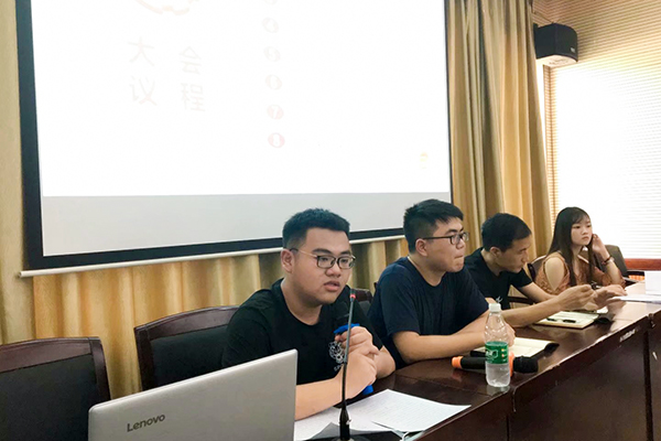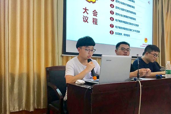 紧接着是由电子商务学院团总支陈龙书记致辞,陈龙分享了他的工作历程,并从加强干部创新能力建设、提高学生自我教育、自我服务、自我管理等方面要求同学们争做品学兼优的团学会干部。