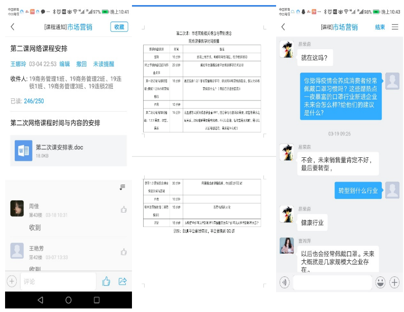 精心挑选教学内容,疫情案例无痕植入。在教学资料的准备过程中,教学团队成员借助各类营销公众号等学习平台搜集大量疫情相关的企业案例,在各知识点中有机融入。如在“需求状态与营销任务”一节授课内容中,以“病毒感染医疗需求”为例说明负需求概念以及应对措施学生深有感触,在“行业环境分析”内容中用“口罩设备购进”模拟活动来解释买方讨价还价能力就比较容易被学生理解。课后在学习通讨论区中通过播放“转行做口罩暴富”、 “中国疫情引起世界厕纸抢购风潮”、“瑞幸咖啡千里送无人咖啡机” 等新闻来设计与知识点及思政相关思考题引导同学们参与讨论,在知识拓展栏目录制了“2020年新冠疫情后的行业机会”等疫情主题的营销讲座拓宽学生视野同时提高学生职业敏锐度。