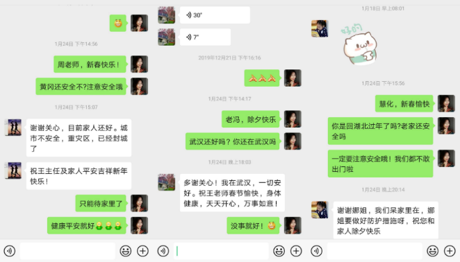自获悉疫情的严重性之后,王娜玲马上通过微信、电话等方式联系湖北籍贯的同事、黄冈职业技术学院以及华中科技等湖北地区同仁,询问当地疫情的情况并表达了关心与问候。对所带的顶岗实习毕业生及时跟踪他们的情况并不定期叮嘱他们疫情安全注意事项,嘱咐不要在此期间去企业顶岗。