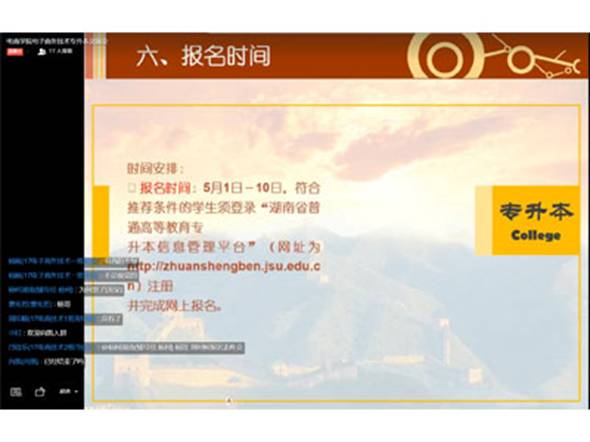 此次交流会分为电商移商专业学习交流会、国商专业学习交流会和电子商务技术专业学习交流会三个直播间开展。会上,主持人黄书敏以PPT形式向同学们讲解专升本的相关知识,让同学们对专升本有初步的了解。会议中,直播间的同学们积极提出问题,各专业的学长学姐们也热情的给与了答复。随后,16级设计1班高宏华、16级电商2班曾盛辉、16级国贸1班李扬以风趣幽默的形式向同学们分享了自己从备考到考前的专升本复习应考经验,并希望在场学生认真备考,珍惜此次学习机会。他们恳切的言辞、用心的分享,赢得了在场学生们一致好评。