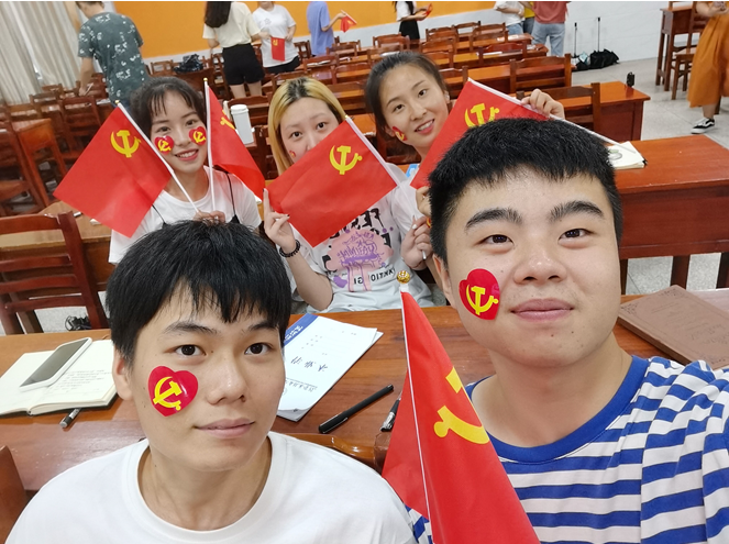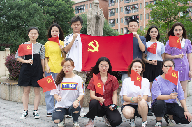 入党积极分子于6月28日在孔子广场、办公楼前庭以及体育馆进行合影,并齐唱《国际歌》,表达对党的热爱,献上自己最美好的祝福。
