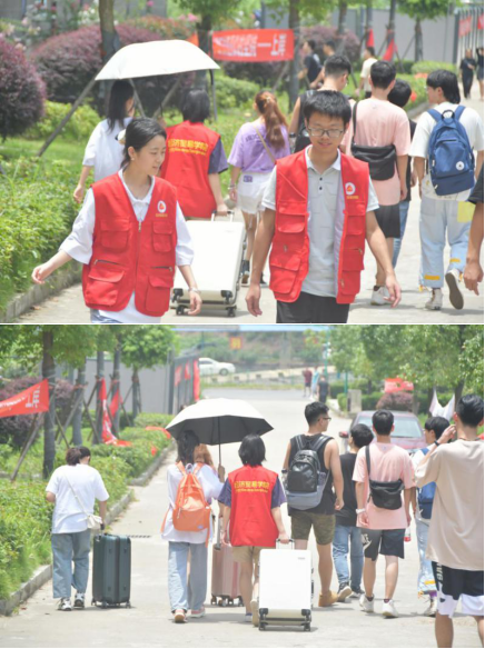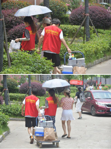 活动现场,志愿者们统一着装,分工协作,有序服务。有的在宿舍楼梯间帮同学扛重物,有的为出宿舍门的同学打遮阳伞,有的为路上的同学提拉行李,有的为出校门的同学送上祝福。一个个汗流浃背的小红马甲被庞大的行李遮盖,一次次迈着稳重的步伐上下楼,温暖了每个归家学子的心。