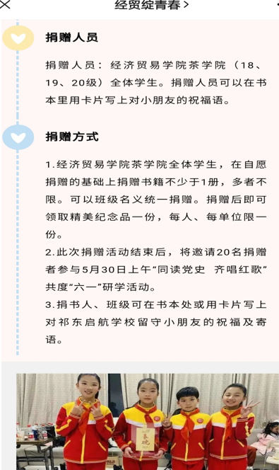 5月24日“经贸绽青春”发布“经济贸易学院学工党支部‘cue你’为祁东起航学校送‘爱心书’”活动,各团支部积极响应号召,捐赠书籍、撰写爱心留言卡。