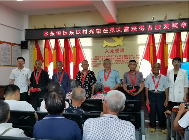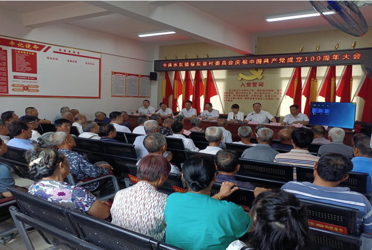大会在雄伟的国歌声中拉开序幕,中共水东镇标东垅村村党委书记翟光庆携全体党员重温入党誓词,观看了视频《中国共产党百年述职报告》,重温了党的成长史和奋斗史,学习了《习近平在“七一勋章”颁授仪式上发表重要讲话》,为全体党员授发了“我是党员,向我看齐”身份牌、赠授了《政治生日贺卡》和纪念品。党员代表畅谈了感想体会,村党委书记翟光庆代表村党委发表讲话,石艳梅书记为17名老党员颁发光荣在党五十周年的党员纪念章,相关领导为两名新党员佩戴党徽。