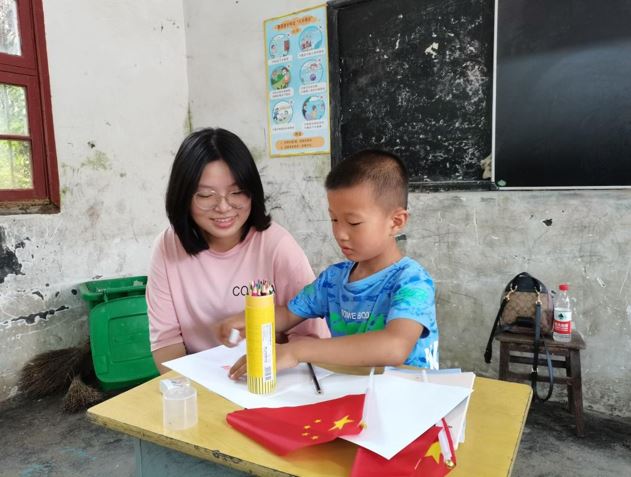 在众多的小孩子中,有一个男孩叫张英俊,父母常年在外务工,独自与奶奶留守在家。在绘画过程中,他迟迟未动笔,明显有些不自信。志愿者戴桢浈主动坐到小男孩的身边,一边鼓励他,一边细心辅导他绘画。画作完成后,张英俊主动上台展示了画作,露出天真灿烂的笑容。 青少年阶段是“拔节孕穗期”,需要耐心的引导和栽培。在会计学院三下乡团队带领下,孩子们不断强化爱国之心,坚定强国之志,片片红心学党史,深深祝福感党恩。志愿者们纷纷表示,愿以自己的力量,学史力行守初心,担当作为践使命。