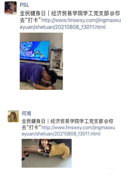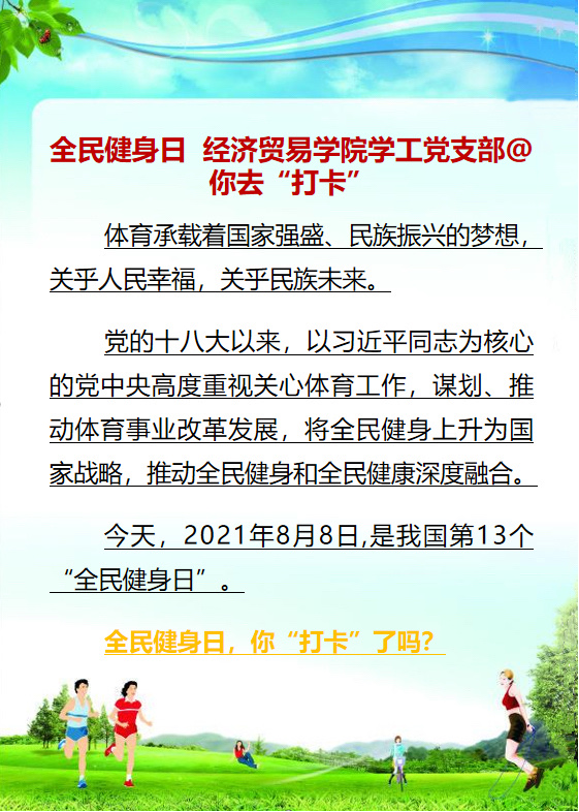 (通讯员 方忆雨 吴君梦)全民健身抗疫情,提高免疫战新冠。2021年8月8日是我国第13个“全民健身日”,经济贸易学院学工党支部组织开展以“全民健身与防疫工作同行”为主题的线上运动打卡活动,倡导青年学生养成良好的体育锻炼习惯,提升免疫力,助力打赢疫情防控阻击战。