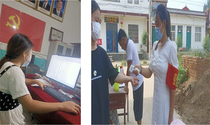 预备党员19移动互联3班马明静是学院团学分会组织部部长,她有多次参加疫情防控志愿活动的经历。今年暑假她在老家河南省柳园镇樊营村进行登记居民疫苗接种信息,排查外来返乡人员,宣传引导疫情防护信息,卡点执勤,体温检测,以及协助医护人员维持核酸检测现场秩序等工作。对村民进行核酸检测过程中考虑到老人不能熟练使用智能手机,马明静专门负责帮助居民注册电子健康卡。每一次志愿活动都让马明静有不一样的收获,马明静说:“暑期过得很充实,作为一名预备党员,我时刻准备着,能为大家提供服务与帮助,让我感到很自豪。”