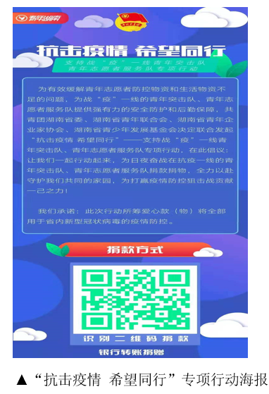 (通讯员 杨韵琴)自今年7月南京禄口机场疫情在全国二次传播以来,为有效缓解青年志愿者防控物资和生活物资不足的问题,为战“疫”一线的青年突击队、青年志愿者服务队提供强有力的安全防护和后勤保障,湖南商务职业技术学院经济贸易学院学工党支部积极响应共青团湖南省委、湖南省青年联合会、湖南省青年企业家协会、湖南省青少年发展基金会决定联合发起 “抗击疫情 希望同行”——支持战“疫”一线青年突击队、青年志愿者服务队专项行动,号召经济贸易学院、茶学院青年学子踊跃参与募捐活动。