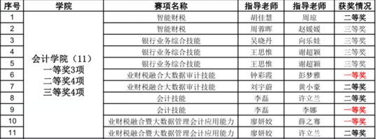 其中,由李磊和李娜老师指导的会计技能团队、廖妍姣和薛之骞老师指导的业财税融合暨大数据管理会计应用能力团队以及钟彩霞和彭梦雅老师指导的业财税融合大数据审计技能团队均获省一等奖。