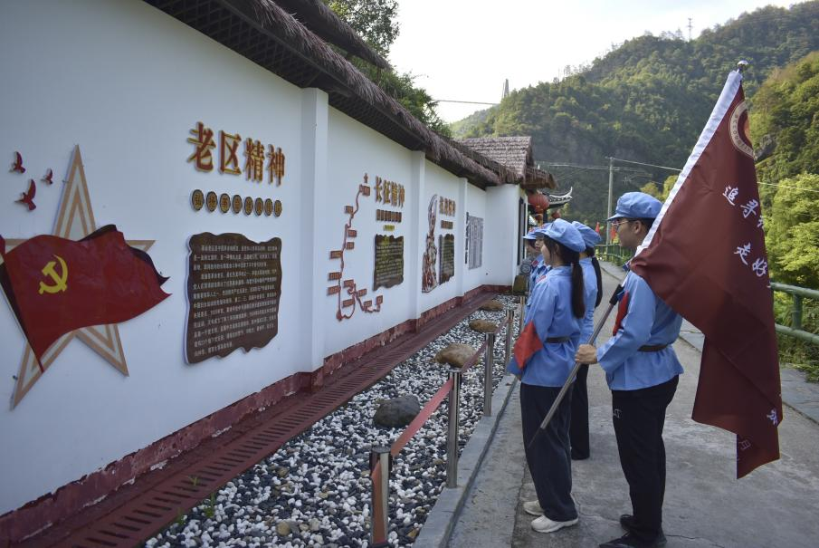 上午8:00,团队成员统一红军着装,佩戴袖章,在红军桥前集合。走上桥面,晃荡的铁索桥、湍急的河流,不禁让我们感受到当时红军过桥的浩荡场面。走过红军桥,映入眼帘的一面吹着号角、举着党旗、冲锋向前的红军战士浮雕。红军“星星之火可以燎原”的步伐从这里疾步向前,“燎原星火”队的追寻之旅从这里开始。跟随道路两侧红旗的指引,我们沿着崎岖的山路,走在由青石块与砂土相间铺就而成的“红军路”上。
