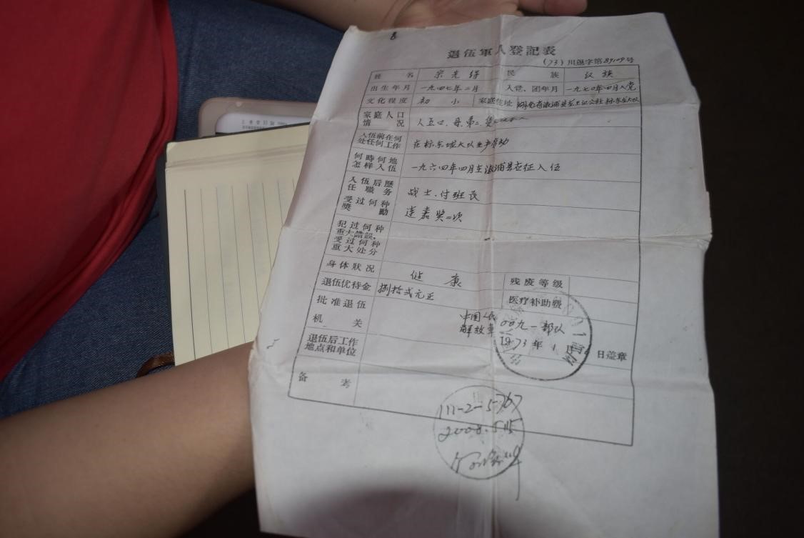 这样的故事经常发生在宋老所在的部队,即使艰辛,回忆起在部队里的件件往事,但他的嘴角始终挂着笑容。“部队生活是我人生中非常重要的一段经历,让我明白了,作为一名老党员,要时时刻刻把人民记在心上,牢记为老百姓服务的初衷。”3年的部队生活,对宋老是一种人生历练,也是一份荣光。翻开宋老的退伍军人登记表,在“受过何种奖励”栏处,写着“连嘉奖两次”5个大字。
