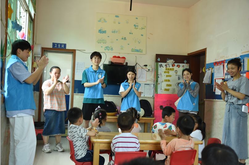 “五星红旗,迎风飘扬,胜利歌声多么响亮……”稚嫩的歌声从白箬铺镇社区幼儿园传来,这是湖南商务职业技术学院旅游管理学院学工党支部的同学正在教小朋友们学唱红色歌曲。