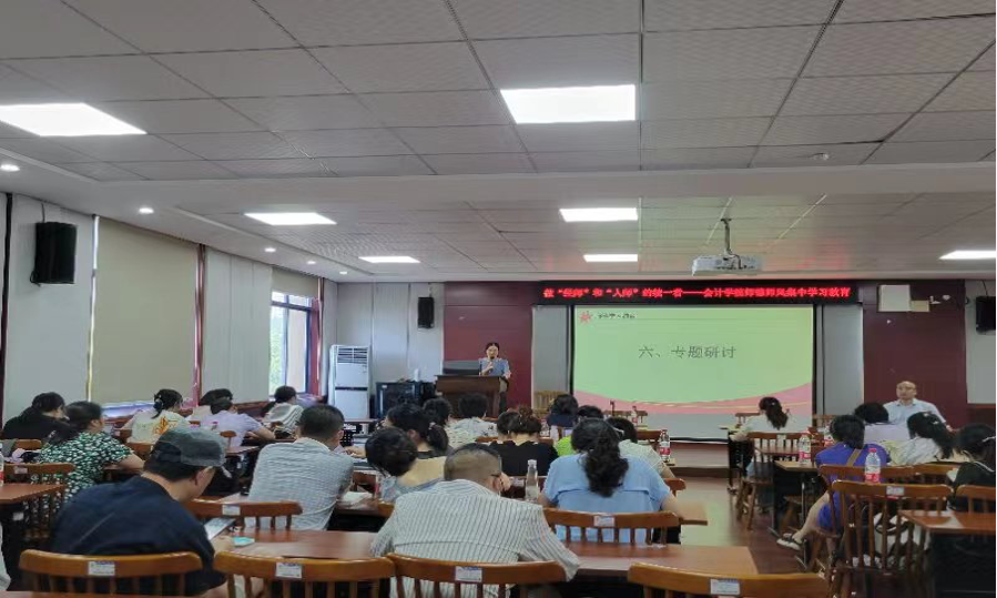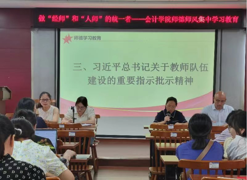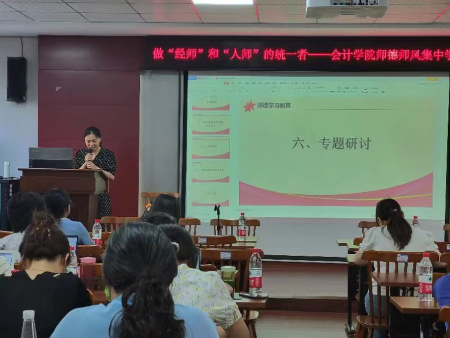 为落实《教育部关于在教育系统开展师德集中学习教育的通知》和省教育厅《转发教育部关于在教育系统开展师德集中学习教育的通知》,根据学校贯彻习近平新时代中国特色社会主义思想主题教育工作要求,7月10日上午,会计学院在二教201召开以“学高为师,德高为范,做‘经师’和‘人师’的统一者”为主题的师德专题培训会。会计学院全体教职员工参加了培训会,会议由党总支书记黄铖主持。