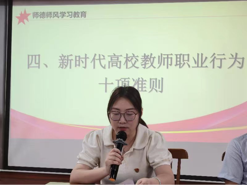 副院长许立兰、党支部书记孙玲、支部委员李娜、张秦分别就以学谋私典型案例、习近平总书记关于教育的重要论述、习近平总书记关于教师队伍建设的重要指示批示精神、新时代高校教师职业行为十项准则等内容组织大家开展了集中学习。