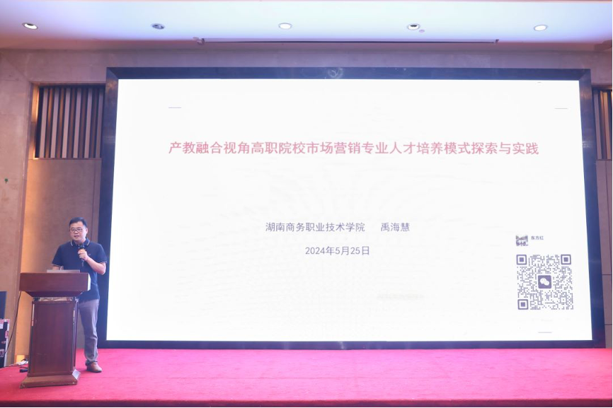 会上,经贸学院市场营销教研室主任禹海慧教授代表学院作《产教融合视角高职院校市场营销专业人才培养模式探索与实践》主题发言,介绍了学院市场营销专业建设的经验,获得参会专家、同行的高度评价。依托能力链、人才链、产业链三链融合,构建数字商务产业链的人才供需适配机制;围绕数字商务岗位群,构建市场营销技能人才成长路径;开发基于数字营销能力延展轴线的“一轴三群七区”的课程群组;打造基于智慧零售产业学院的“三融三体”产教融合共同体;结合三维递进式场景育人教法改革探索,形成数字营销引领方向、专业技能成长路径清晰、岗(训)课赛证融通、产教融合协调发展的人才培养基本框架与模式。