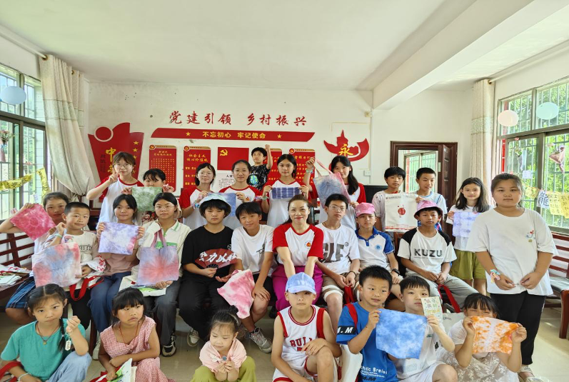 “嗲嗲,看!这是我染好的衣服”一位参与扎染美育体验课的小学生对身后的爷爷,兴奋地说!7月2日至6日,湖南商务职业技术学院“楚怡青春行”团队赴新邵县潭溪镇长铺小学开展以“华章荟萃,文化生根”为主题的“三下乡”社会实践活动。