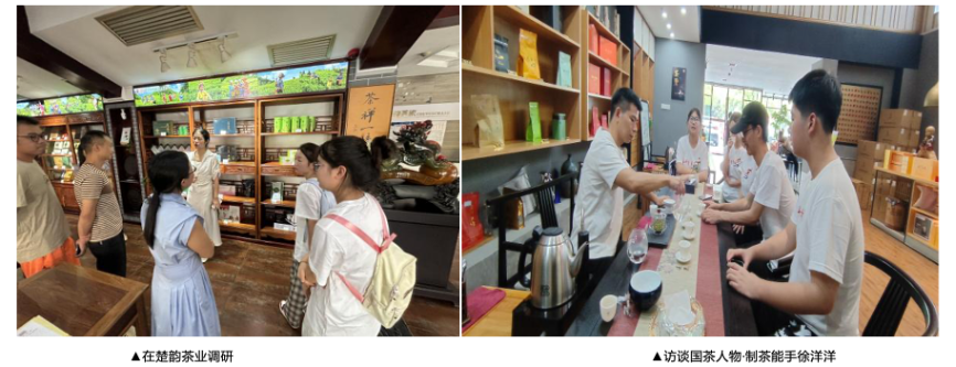实践团首站到访了壶瓶山茶业有限公司,公司董事长邹总的“敬畏之心”深深触动了团队成员。在渫峰名茶有限公司,覃小洪大师的“好茶自己会说话”的理念,展示了通过技术创新推动茶产业发展的决心。实践团成员也从中感悟到“敬畏自然、尊重传统、思维创新”企业文化对茶产业发展的促进。茶祖·印象茶业有限公司技术总监徐洋洋强调了手工制茶的重要性,作为“石门银峰”茶叶加工技术的第三代核心传承人,他说:“虽然现代化机械设备可以提高生产效率,但仍然无法替代手工技艺对于保持茶叶原有特质、改善口感及香气的风味手法”。他的话语激励着青年学子们传承和发扬国家优良技艺。湖南楚韵茶业有限公司的马杰董事长和云中君茶业有限公司的贾芸贾总,分别展示了企业如何通过研发、生产、销售一体化和诚信经营,推动茶产业的发展。他们与实践团成员深入讨论了营销、品牌推广和市场开拓的重要性。