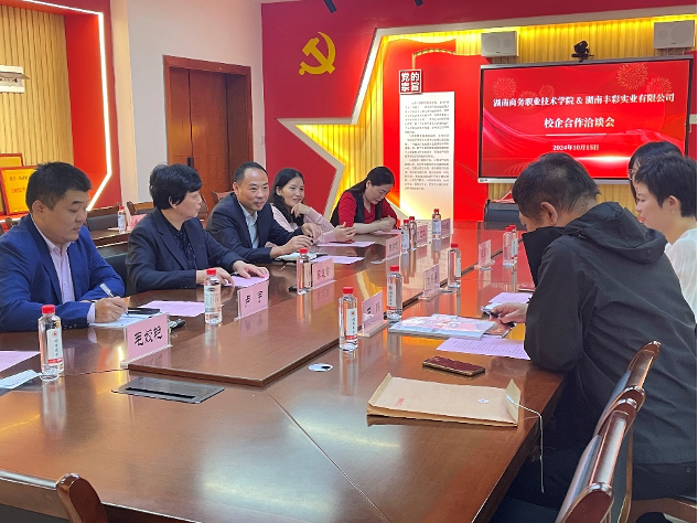 2024年10月15日,湖南丰彩实业有限公司刘琛馨副总经理一行四人来访经济贸易学院进行校企合作洽谈。校企双方就连锁商业发展现状、人才供需、师资与实训基地共享等方面进行深入交流,达成了基本合作框架。