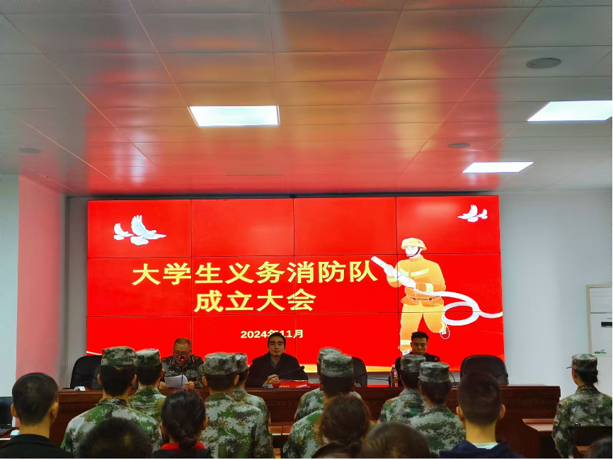 为贯彻落实《中华人民共和国消防法》和上级要求,加强消防队伍建设,充实消防安全力量,完善群防群治体系。学院于2024年11月21日在学生教官自训队会议室举行了大学生义务消防队成立大会。