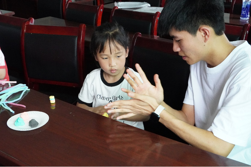 会后,志愿队开展了关爱留守儿童活动。同学们精心设计了趣味游戏和手工制作环节。社区孩子们用粘土、扭扭棒塑造出可爱的小物件,在纸盘上描绘五彩斑斓的梦想。活动现场欢声笑语不断,他们纯真的笑容让志愿者倍感温暖。
