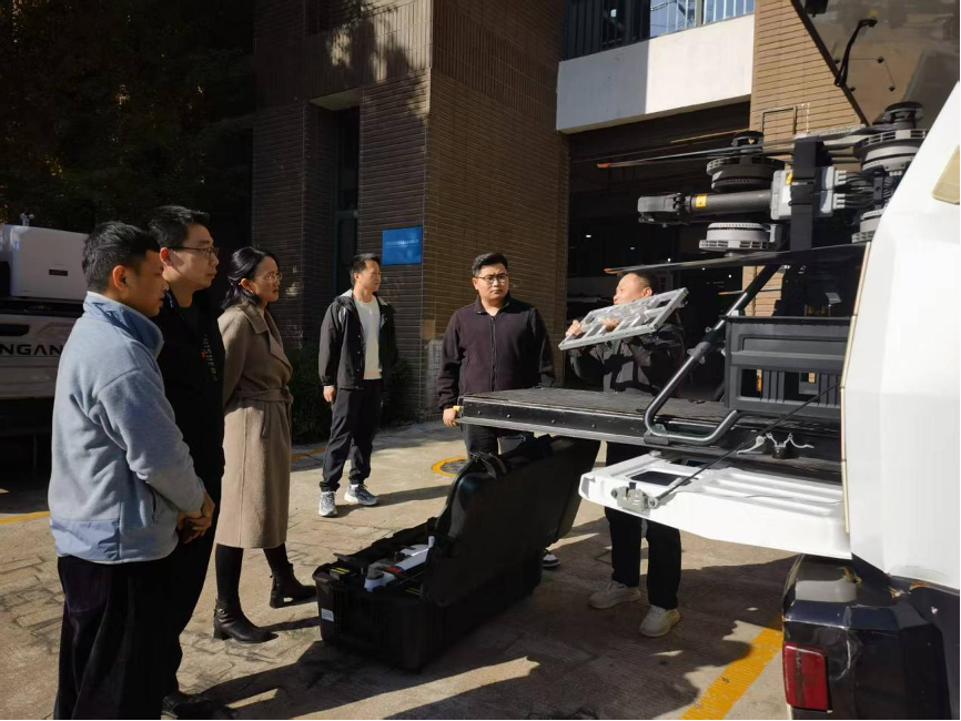 应企业邀请,12月4日,调研团队前往沅江市,实地考察了省应急救援无人机分队。项目现场展示了搭载应急侦测、通信中继等模块的垂直起降无人机系统,该体系能在灾害现场为指挥决策提供关键技术支持。通过技术人员系统讲解与实景演示,团队对工业级无人机在应急救援领域的集成化、系统化应用有了更直观的认识,也为相关课程内容更新与教学模块设计提供了真实案例。