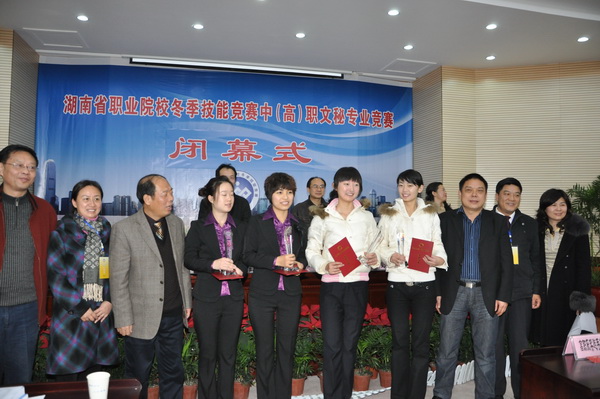11月29日10:00,由省教育厅主办、湖南省教育科学研究院职成教研究所承办、湖南商务职业技术学院协办的2009年湖南省职业院校冬季中(高)职文秘专业技能竞赛闭幕式在我院办公楼学术报告厅隆重举行。湖南省教育科学研究院职成教研究所副所长兼赛点组织委员会副主任陈拥贤、省派巡视员汪忠明、学院党委书记彭建国、学院院长兼赛点主任张新民、学院副院长兼赛点副主任杨文涛、学院副院长张朴出席了闭幕式。自此,2009年湖南省职业院校冬季中(高)职文秘专业技能竞赛在我院圆满结束。