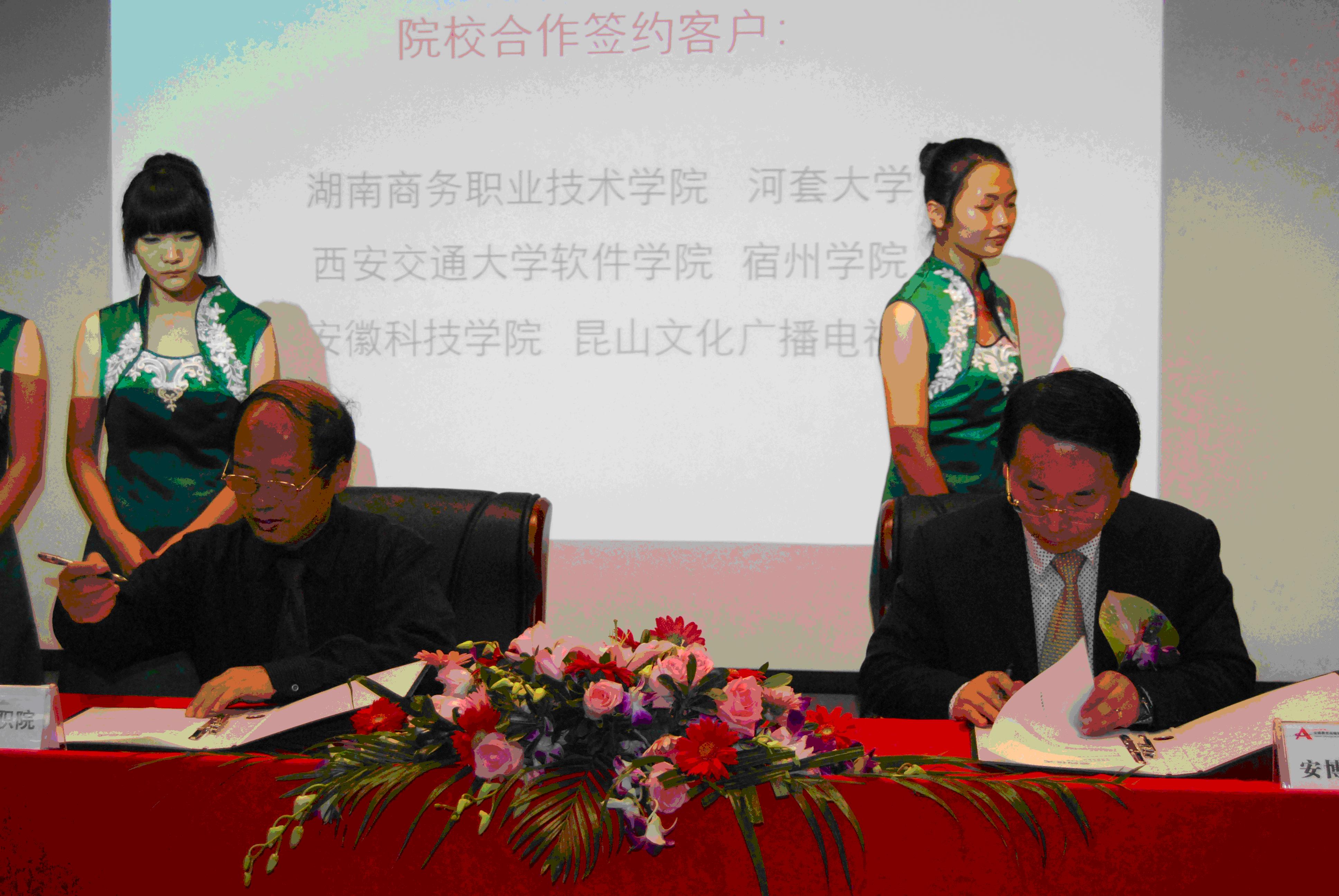 2009年11月17日,我院张新民院长、杨文涛副院长、袁仁水总支书记、冯中平副处长一行前往安博(昆山)服务外包产业园举行的“2009首届安博教育高端论坛”,在会议期间,我院领导受到了安博高层领导的热烈欢迎,并对昆山服务外包基地进行了全面的考察,与对方进行了深入的交流。在原有合作的基础上,在友好的气氛下,双方对未来的合作进行了进一步的探讨,最后,双方就专业共建合作达成了共识,签署了专业共建协议。院长张新民与安博职教事业部总经理黄贵洲在大会上进行了签约仪式。