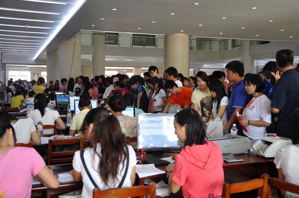 新生报到处安排在学院办公楼一楼大厅,各职能部门和系部工作人员全体总动员,积极投入到迎新工作。新生入学报到的工作在老师、同学的通力合作下进行得也十分顺利。学院按系部设置报到处,分设了银行卡及现金缴费点以方便新生缴纳入学费用,各栋宿管和志愿者们帮着新生们领取生活及军训用品。学院食堂也已为新生准备了可口的饭菜。中国移动、联通、电信、超市等也在校园内开展各种优惠活动,为新生们提供便捷的通讯和生活服务。