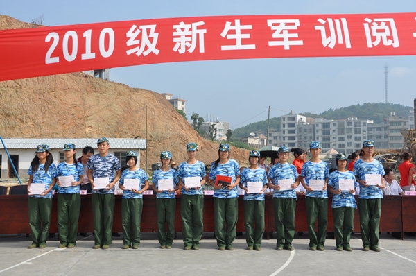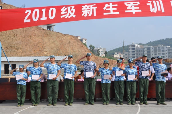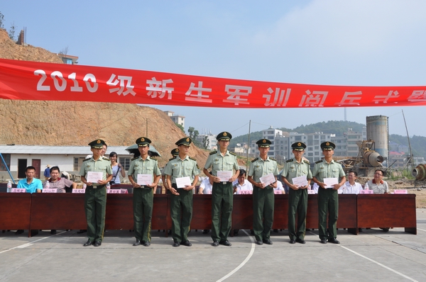 (记者 晏语泽 李思)9月12日8:30,学院在后操场召开2010级新生军训阅兵式暨总结表彰大会。与会领导有学院院长张新民、军训团团长彭勇、学院党委副书记孔军山、军训团政委、学院副院长张朴、副院长杨文涛、军训团副团长周尚国、教务处处长伍建桥、学工处处长刘沈荣以及各系领导。学院党委副书记孔军山主持大会。