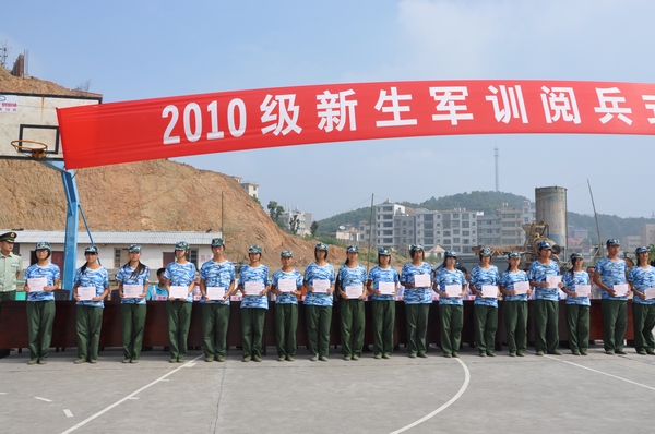 随着激昂的检阅进行曲响起,张新民院长在军训团团长彭勇的陪同下,对各连队进行了检阅。随后,军训团政委、学院副院长张朴对此次军训作总结报告。他说,短短十天的训练,同学们按计划完成了军训任务,并取得了优异的成绩。在部队领导的高度重视,教官的严格施训及学院全体教师的辛勤指导下,同学们增强了组织纪律观念,规范了日常生活行为,并锻炼了坚强的意志,培养了吃苦耐劳的精神。通过军训,同学们对部队生活有了初步了解,在心目中树立了人民军队良好的形象。更重要的是军训融洽了同学之间的感情,增强了团结意识和集体荣誉感。同时,他也指出了本次军训中同学们的不足之处,并希望同学们能在以后的学习生活中予以克服。最后,他对2010级新生寄予厚望,希望他们将军训中培养的军人品质和团队精神带到以后的学习、工作和生活中去,成长为不怕苦、不怕累、敢于克服一切艰难险阻的坚强战士。
