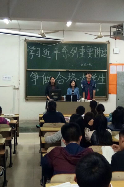2016年10月19日晚上八点,由经济贸易学院组织的“学习习近平系列重要讲话精神——做合格大学生”宣讲会在大一新生各班责任教室举行,经贸学院学生党支部与大一新生们一起进行问题解答和部分文章的讲解,并在班级进行核心价值观的微宣讲。
