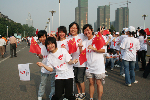 北京奥运圣火6月4日上午8时许在湖南风景如画的爱晚亭前开始传递,商务学院4千多名师生齐聚岳麓大道长沙市政府前,迎接圣火的到来。