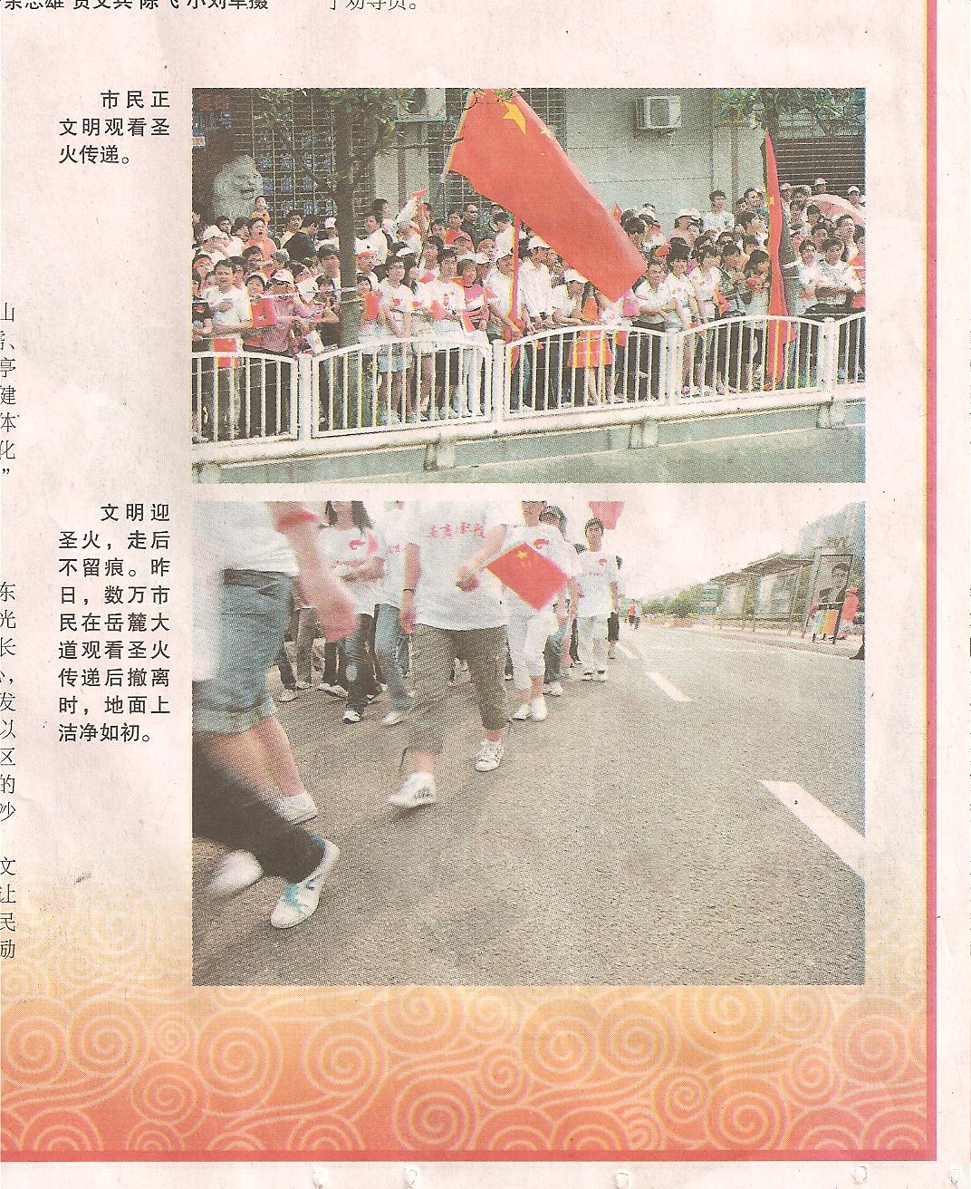 据《长沙晚报》“圣火耀星城,4小时圣火传递见证长沙文明”图文报道,其中一幅照片为我院学生撤离时情景。说明我院学生在此次迎圣火活动中,不但热情,同时也十分文明,体现出当代大学生良好的精神风貌。