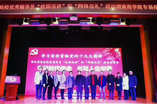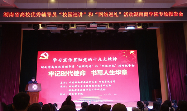 12月13日下午,由中共湖南省委教育工委、湖南省教育厅主办的“学习宣传贯彻党的十九大精神——湖南省高校优秀辅导员‘校园巡讲’和‘网络巡礼’”活动报告会在湖南省商学院学术报告厅举行。本次“双巡”活动主题为“牢记时代使命 书写人生华章”。按照省委教育工委的工作安排,我院副院长廖良林、学生工作(部)长唐柳荷、团委书记杨明及全体辅导员、学生党员代表共50人前往商学院聆听“校园巡讲”报告会,再次近距离感受党的十九大的丰富精神内涵。