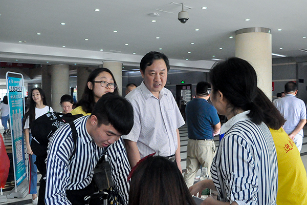 一大早,党委书记周忠新、院长孔军山率综合办公室等部门负责人来到了迎新现场,慰问新生和工作人员,见到报到现场的学生及家长时,便与他们拉起了家常。院领导告诉家长们,学院领导班子视教职员工为姊妹来关心,广大教师视学生为自己儿女来培养,同时希望大家视学院为自己的家来呵护。整个商务学院就是一个温馨的大家庭,把孩子送到这里,完全可以放心。接着又语重心长地嘱咐新生,你们要努力学习,学商务之道,创精彩人生,要为早日成为一名优秀的湘商新人持续奋斗!