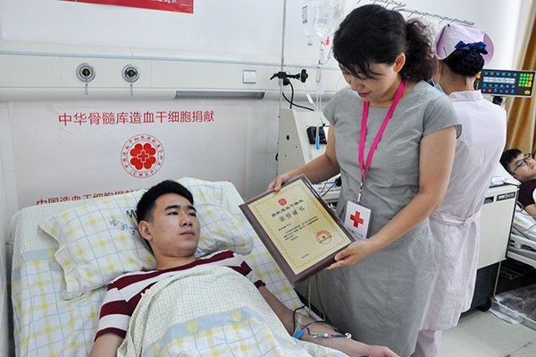 省红十字会代表给陆先蜜同学颁发“捐献造血干细胞荣誉证书”