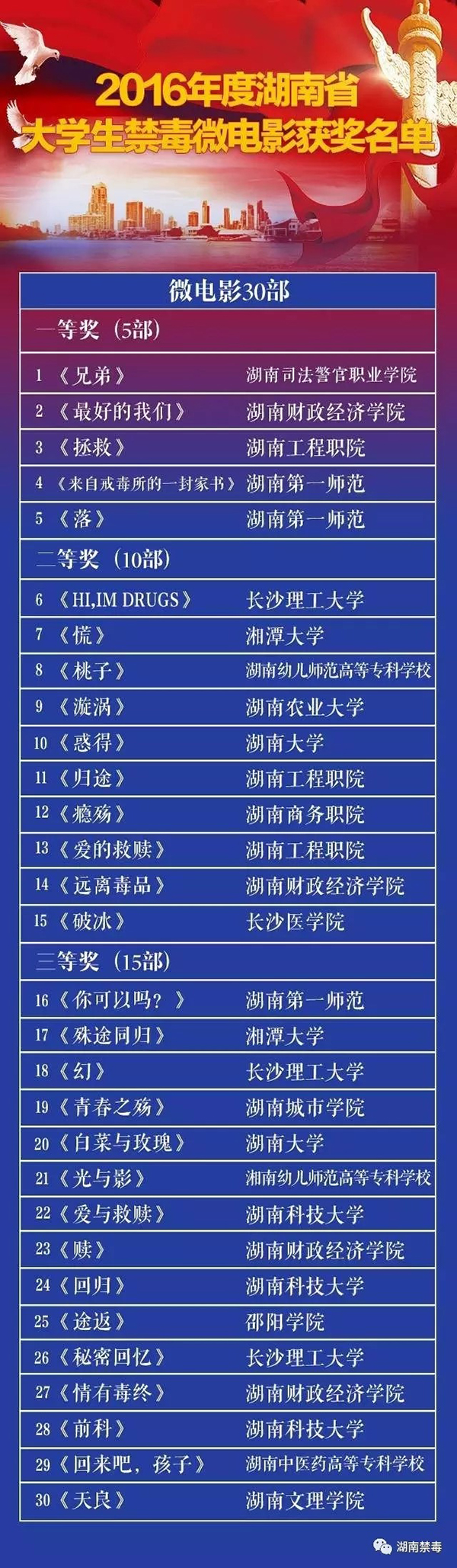 近日,省教育厅、省禁毒委员会公布了“无毒青春,健康生活”为主题的2016年度湖南省学生毒品预防教育项目评选结果,我校学生禁毒微电影作品《瘾殇》荣获2016年度湖南省大学生禁毒微电影二等奖。(学工处 供稿)