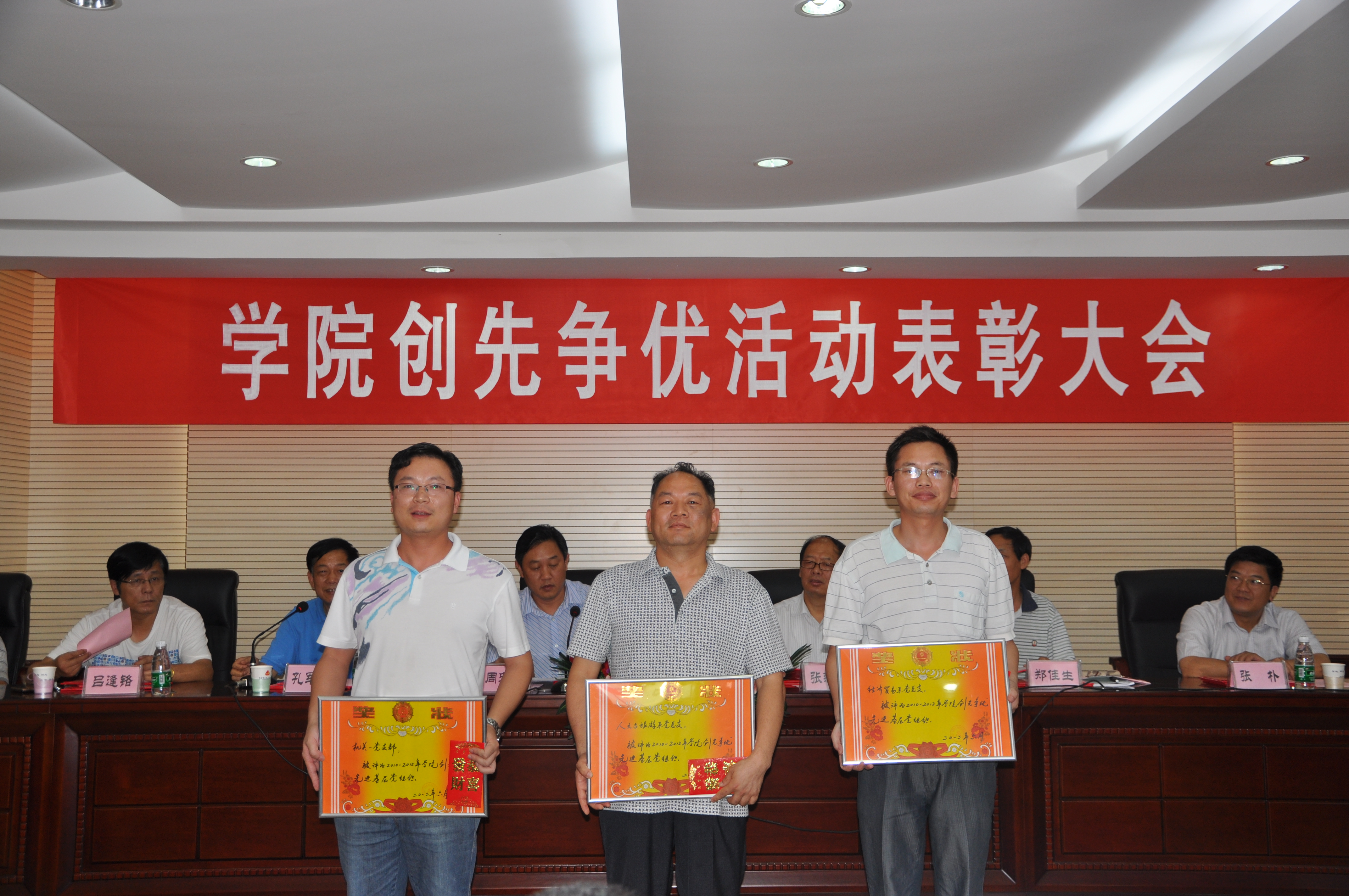 随后,学院纪委书记郑佳生宣读了学院2012年创先争优表彰文件。经过各党支部、党总支评选,学院授予人文与旅游系党总支部、经济贸易系党总支部、机关一党支部3个基层党组织“先进基层党组织”称号;授予谢虎军等20名同志“优秀共产党员”称号。人文与旅游系党总支副书记聂振华、会计系石辉金同志分别代表先进基层党组织、优秀共产党员在会上发言。