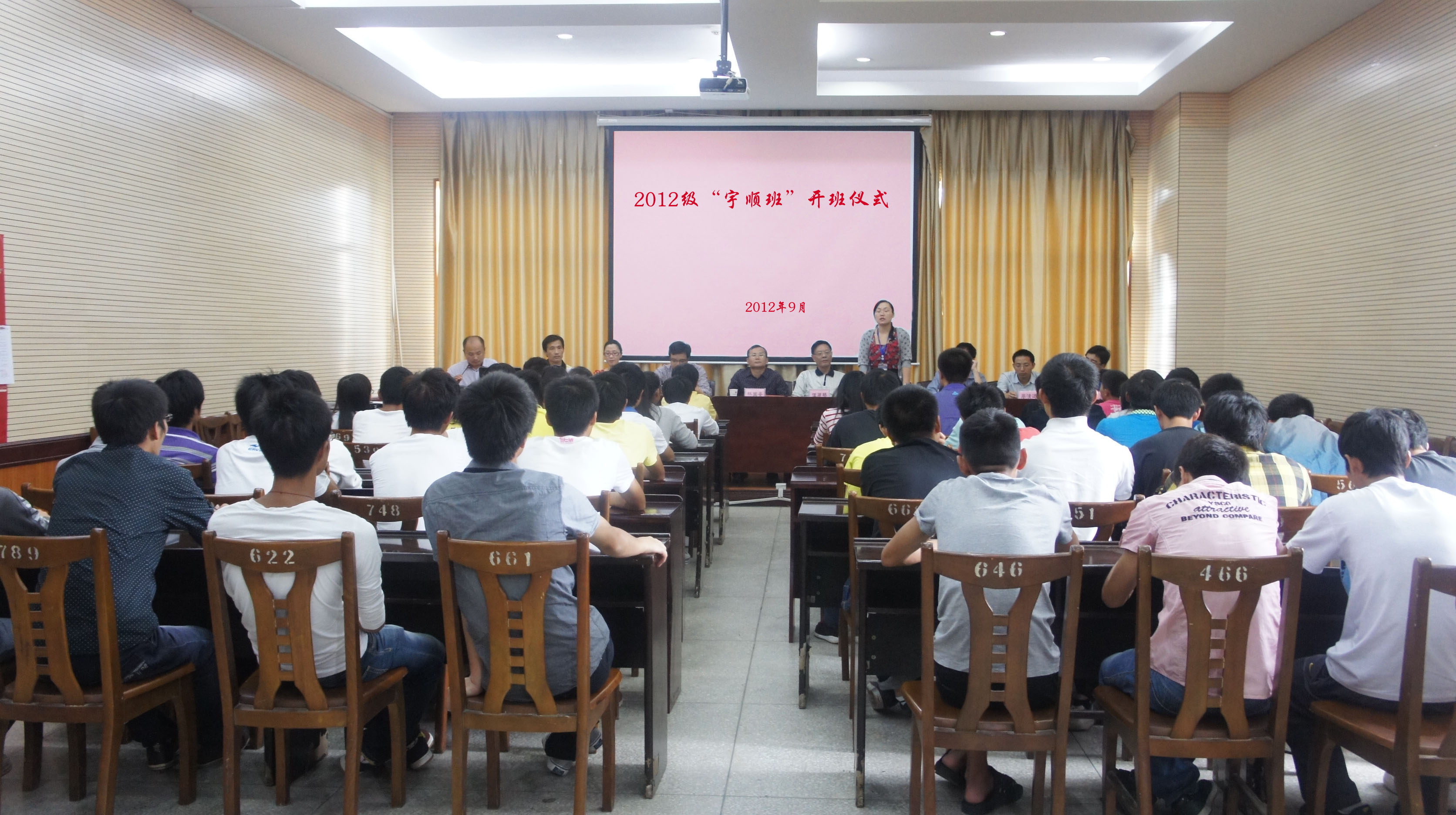 9月25日下午,学院在办公楼第四会议室举行了2012级“宇顺班”开班仪式。学院副院长林国安,教务处处长伍建桥,校企合作办主任刘芳芳,电信系主任黄会雄、党总支书记袁仁水、副主任廖清远出席开班仪式,宇顺电子长沙科技园人力资源经理鄢勇志、招聘主管潘蝉和高级招聘专员罗勇应邀参加开班仪式,开班仪式由电信系刘明浩老师主持。