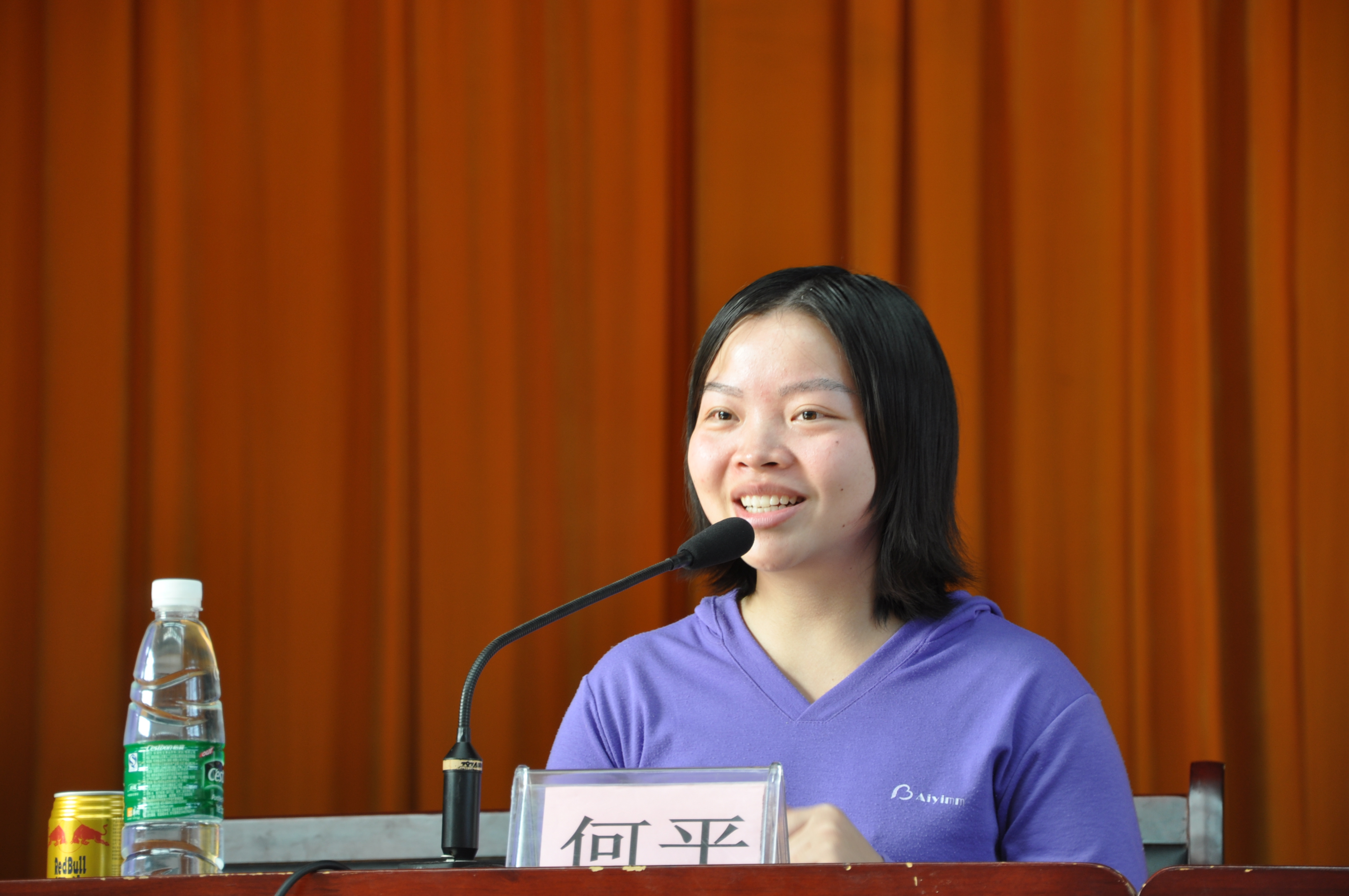 何平同学用平淡朴实的语言,给现场的大学生们讲述了她不畏艰难、励志向上的事迹。她是湖南科技大学在读研究生,从小妈妈就有间歇性精神病症,高二的时候爸爸脑溢血且丧失劳动力,高三的时候弟弟更是先天性心脏病突发,这一切变故何平同学都默默地承受着。生活的艰辛没有压垮这个弱小的女孩,反而磨砺出她的不屈和坚强。她始终不忘学习,即使在给爸爸筹钱的途中也挤出时间看书,最终考上了大学,爸爸和弟弟的病情也在她的努力下稳定下来。为了维持生活,她最多的时候兼职七份工作。