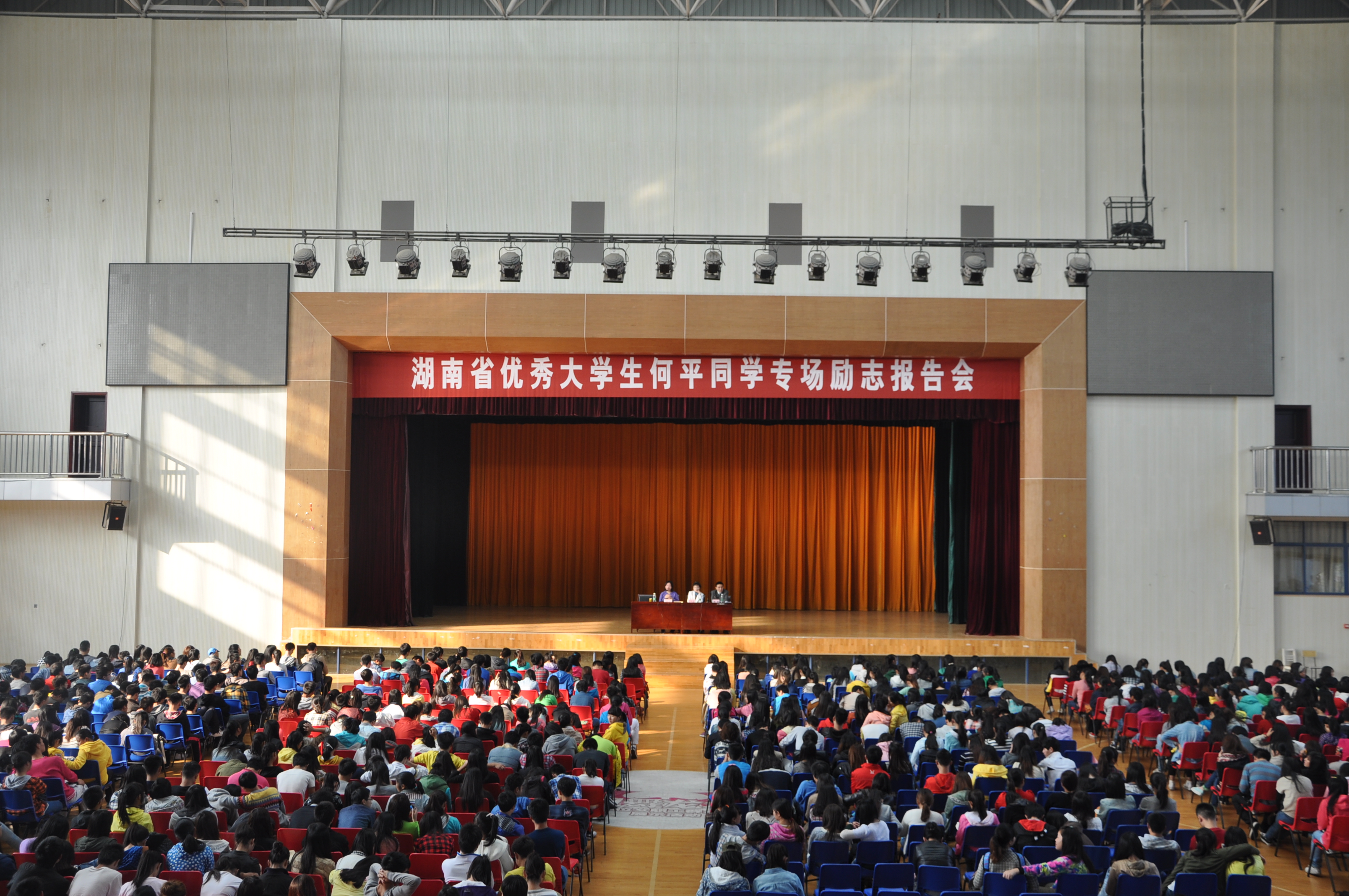 10月22日下午3点,湖南省优秀大学生何平同学专场励志报告会在我院体育馆隆重举行,思政课部主任邓艳君、学生工作处副处长杨明出席报告会。2000余名学生代表聆听了报告。报告会由杨明主持。