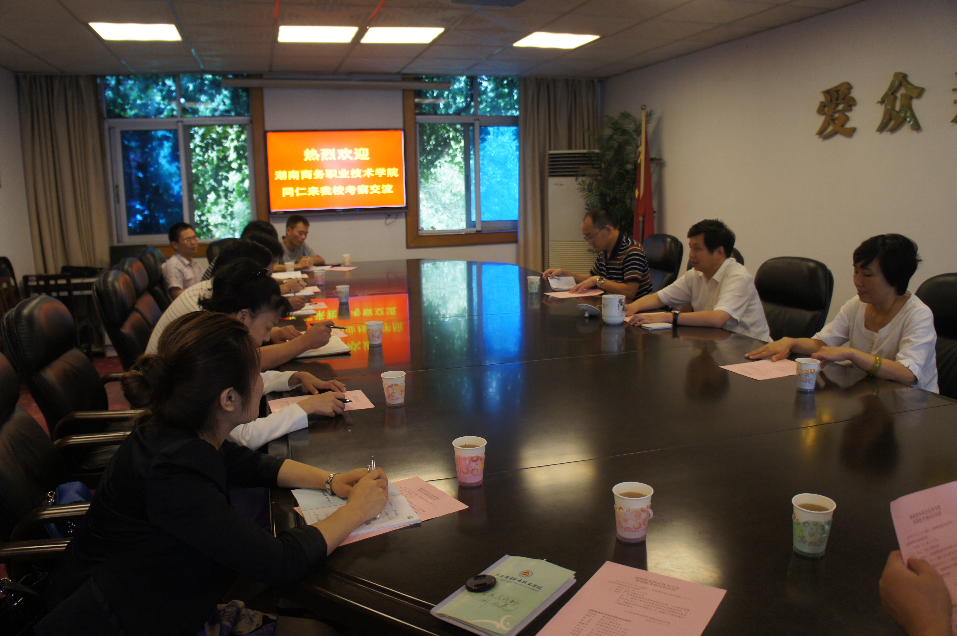 在长沙民政职院办公楼三楼会议室,长沙民政职院党委书记蒋晓明、纪委书记赖小萍、商学院党总支书记徐怀热情接待了我院考察学习人员。
