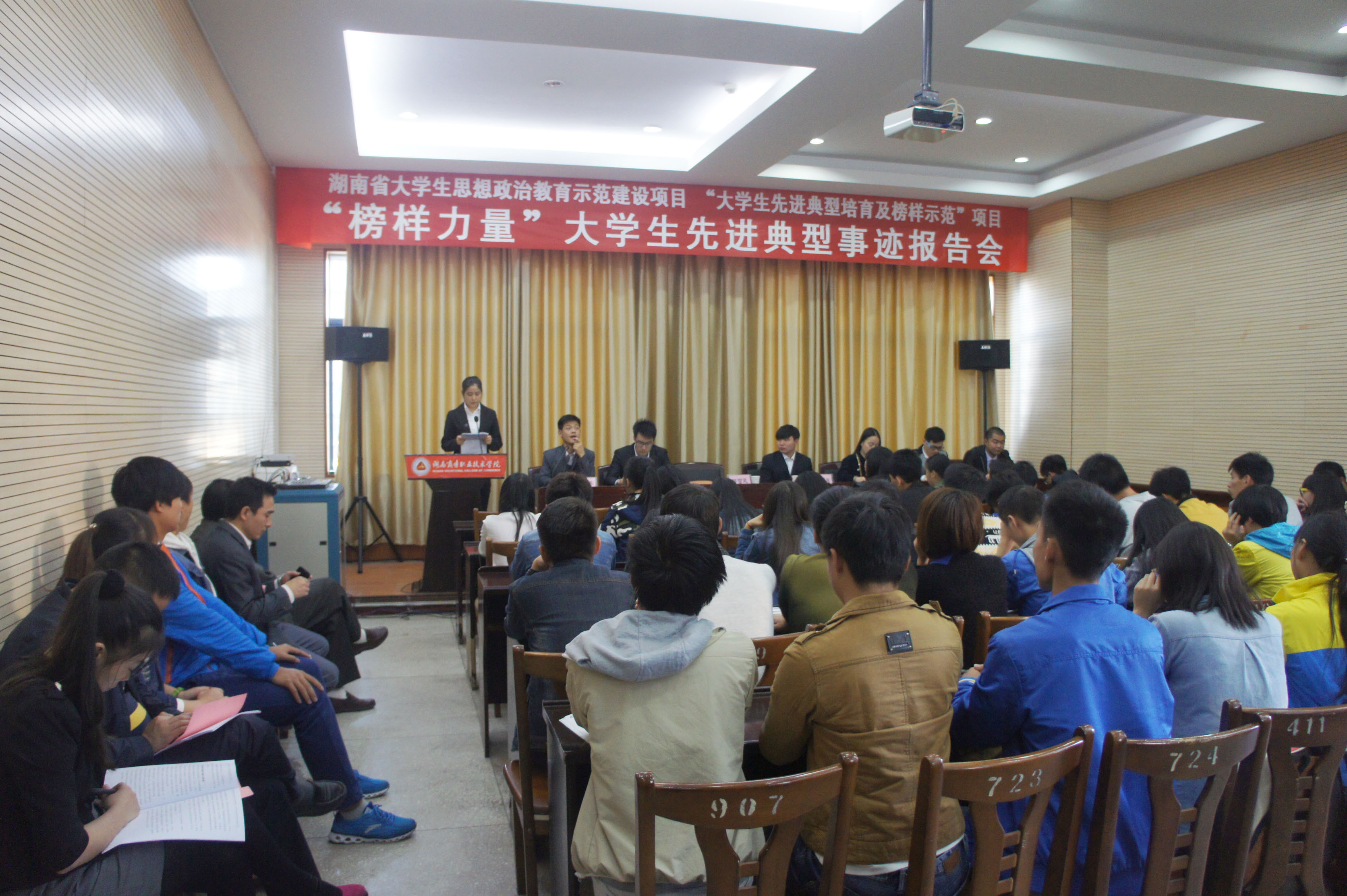 有榜样的地方就有进步的力量,为鼓舞学生斗志、给予学生正能量、指引前进方向,我院积极参与湖南省大学生思想政治教育示范建设项目之大学生先进典型培育及榜样示范项目,并与湘潭大学、湖南师范大学和湖南软件职业技术学院联合举办了“榜样力量”大学生先进典型事迹报告会,首场报告会于11月4日14时在我院办公楼一楼第五会议室如期举行。学院副院长张朴、湖南软件职院学工部部长陈力新;湖南师范大学教育管理科科长涂榉耀;湘潭大学思政科老师卢芳及我院学生工作处负责人出席报告会。湖南软件职院和我院的120多位学生代表到场聆听。