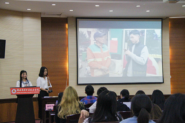 此次比赛经过初赛、复赛的层层选拔,共计六支队伍进入了决赛。作品形式多样,既有读书报告会、行走的课堂,也有微电影、情景剧等;作品内容丰富,既有感恩亲情的告白,关爱环卫工人的《致敬“黄玫瑰”》,也有《拒绝校园贷 莫负青春债》的理性思考,以及呼唤雷锋精神的传承,号召信仰的力量等。比赛过程中,六支队伍的表现各具特色,现场高潮迭起。其中,17商英2班的同学以读书报告的形式讲演了作品《信仰的力量》,主讲人从《共产党宣言》的阅读入手,用一个个小故事生动地阐述了信仰可以给予人的无限力量,听之热血沸腾。 17移商2班将ppt和视频结合,向观众们详细地展示了他们的实践活动作品《致敬“黄玫瑰”》。他们不仅对环卫工人进行了深入采访,还亲身体验了环卫工作的辛苦与不易。最后,主讲人引用习近平总书记的讲话“要像保护眼睛一样保护生态环境,像对待生命一样对待生态环境”倡导同学们树立起“保护生态人人有责”的意识,激起了与会者的强烈共鸣。17电商2班的情景剧《无知的代价》以“大学生法盲”为切入点,通过生动的表演,揭示了“知法懂法”的重要性,呼吁“法治中国人人有责”,令人深思。
