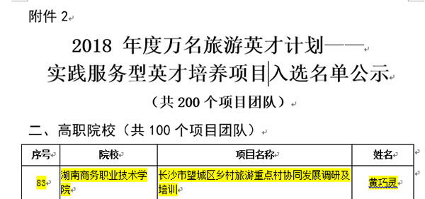 2018年6月13日,从国家文化和旅游部传来喜讯,经由文化和旅游部组织专家评审,旅游管理学院伍欣老师主持的《旅游信息化应用课程开发》入选“双师型”教师培养项目;由16旅管1班学生黄巧灵领衔的《长沙市望城区乡村旅游重点村协同发展调研及培训》入选实践服务型英才培养项目,两个项目均是湖南省高职层次上唯一入选项目。