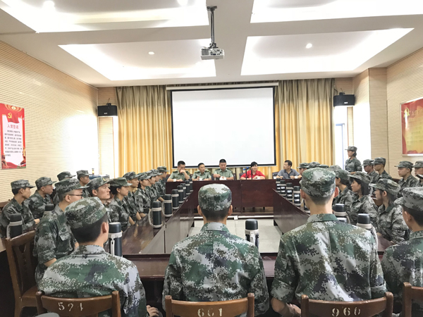 我院学生军训工作帮训单位,长沙南国利剑国防教育基地的王政华副主任对集训工作做出了具体的工作部署,他阐释了“四会”教学法以及教学实施步骤,对暑期集训内容进行分块讲解,包括作风、队列、战术等内容。