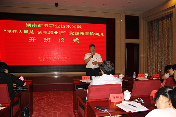 7月25日上午,党委书记周忠新带领大家向毛泽东主席铜像敬献花篮,重温入党誓词,参观毛泽东纪念馆专题纪念馆和毛泽东故居,追忆毛主席的革命历程,缅怀毛主席的丰功伟绩。下午,在嘹亮的《中华人民共和国国歌》歌声中,湖南商务职业技术学院韶山党性教育学习培训班正式开班。党委周忠新书记作了动员讲话,他指出:韶山是伟大领袖毛主席的故乡,培训就是通过回顾以毛泽东为代表的共产党人艰辛奋斗史,感受一代伟人的成长之路,进行生动的爱国主义教育和党性教育洗礼,使党员干部增强党性锻炼,补强精神之钙,将红色基因嵌入灵魂、铸入血脉、深入骨髓、融入工作,进一步振奋精神、坚定信心、真抓实干、锐意进取。他对大家的培训学习提了三点要求:一要转变角色,端正学习态度;二要遵守培训班安排,严守学习纪律;三要融汇贯通,提高学习效果。