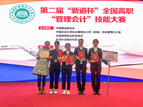 本网讯(石辉金) 11月24日,从河北唐山传来喜讯,由我校会计学院16级会计1班唐青、周娜,16级会计2班陈蓉,17级会计3班刘艳组成的参赛团队在第二届“新道杯”全国高职“管理会计”技能大赛(行业赛)中以超出第二名64分的绝对优势荣获得特等奖!