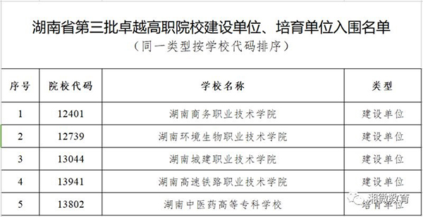经专家评审、评审委员会审议,我省第三批卓越高职院校共确定了4个建设单位和1个培育单位。湖南省一流特色专业群建设确认120个建设项目及18个培育项目。